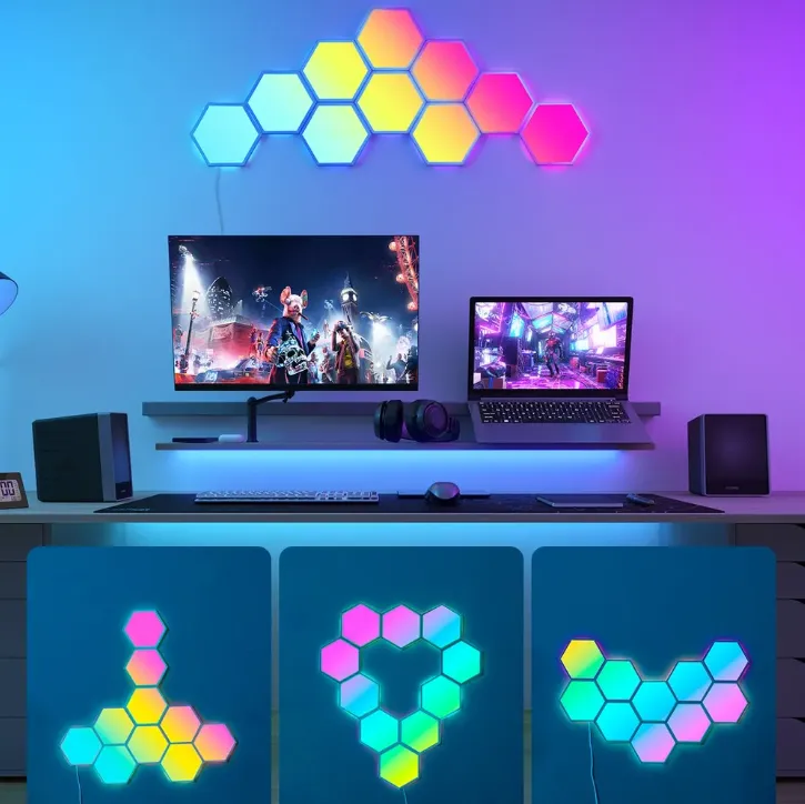 Govee H6061 to zestaw dziesięciu sześciokątnych paneli LED RGBIC przeznaczonych do dekoracyjnego oświetlenia ścian wewnątrz pomieszczeń. Dzięki segmentowej technologii RGBIC każdy panel może wyświetlać kilka kolorów jednocześnie, co pozwala stworzyć efektowne gradienty i dynamiczne wzory świetlne. Idealny do pokoju gracza, salonu, gabinetu czy kina domowego. Zestaw zawiera elementy umożliwiające łatwą instalację — klejenie modułów na czystą, gładką powierzchnię ściany.