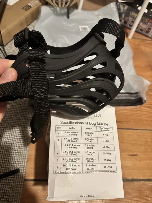 - Upewnij się, że rozmiar jest odpowiedni (zgodny z wymiarami kufy). Kaganiec nie może obcierać ani być zbyt luźny.